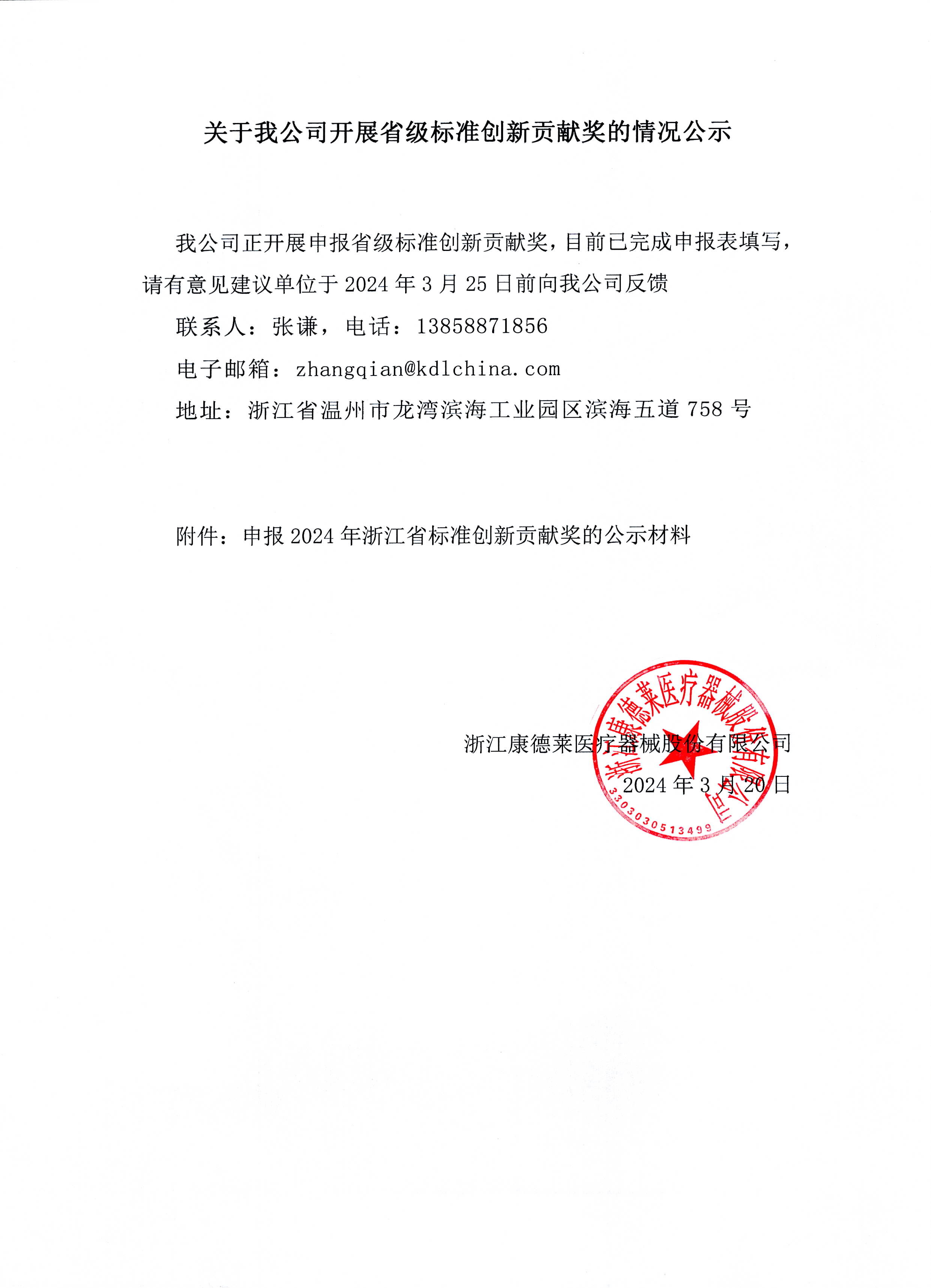 關于我公司開展溫州市標準創新貢獻獎的情況公示